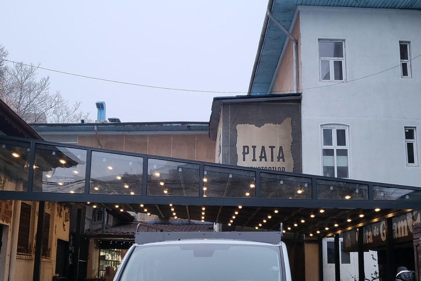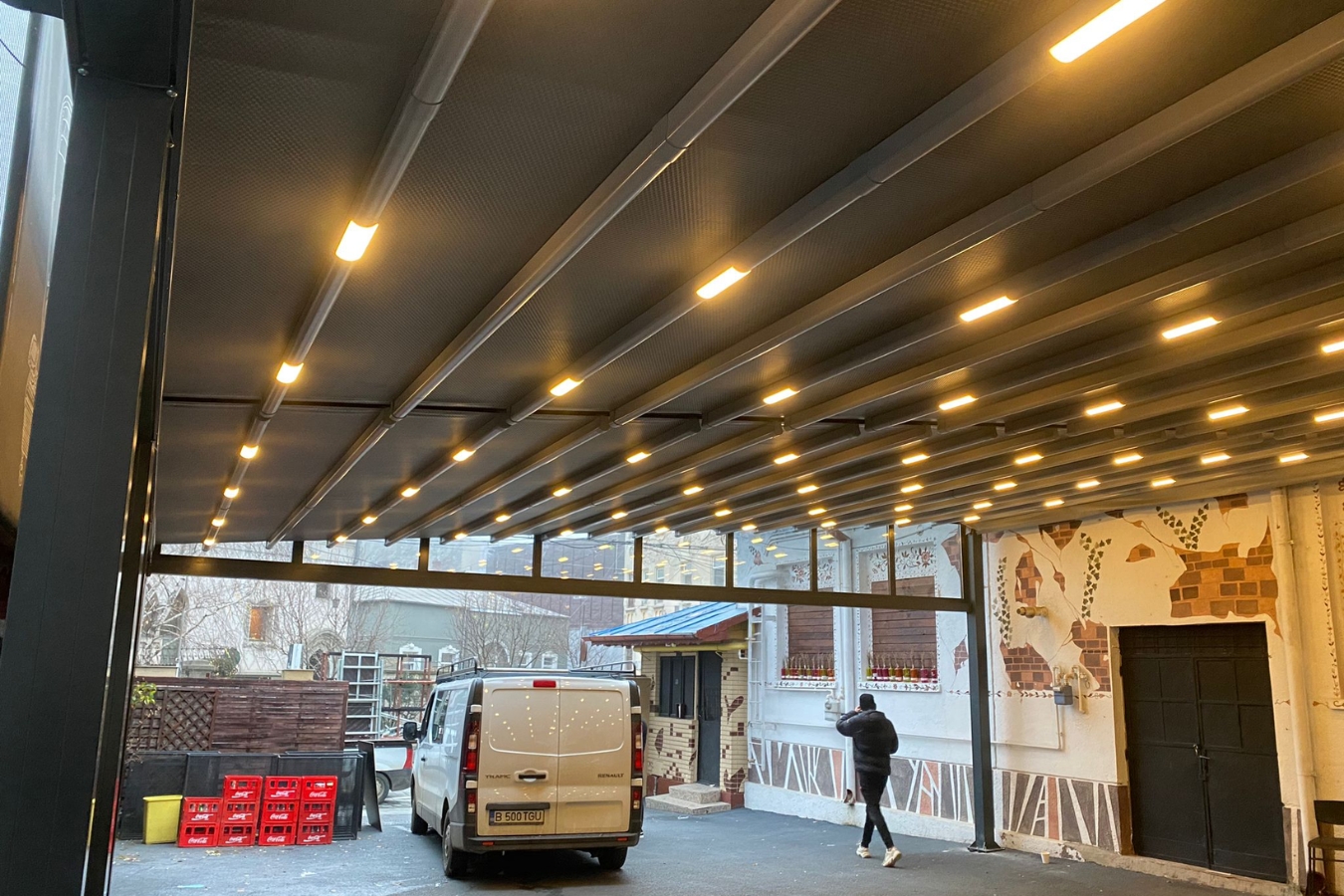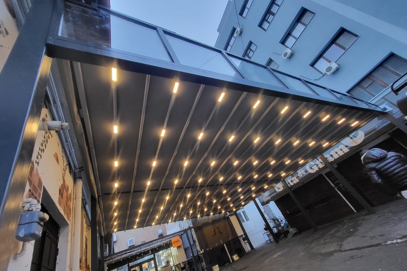 Acest sistem modern asigură confortul clienților indiferent de vreme, fiind perfect adaptat cerințelor locației. Materialele de calitate și designul minimalist completează atmosfera elegantă a restaurantului, creând un spațiu plăcut pentru oaspeți.