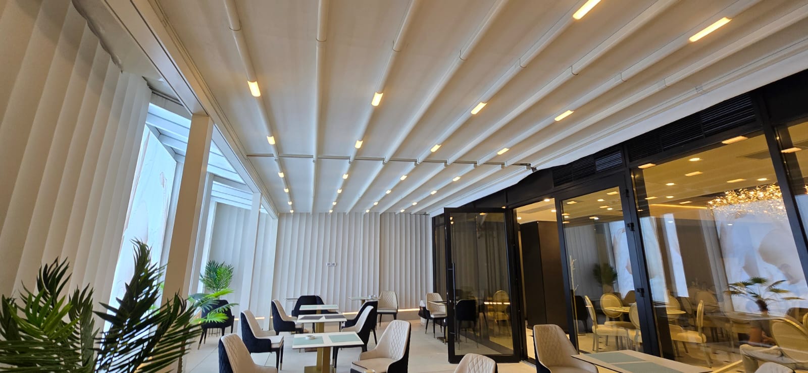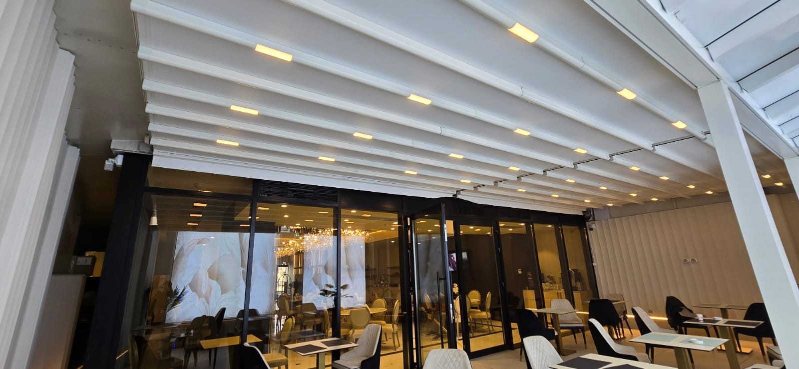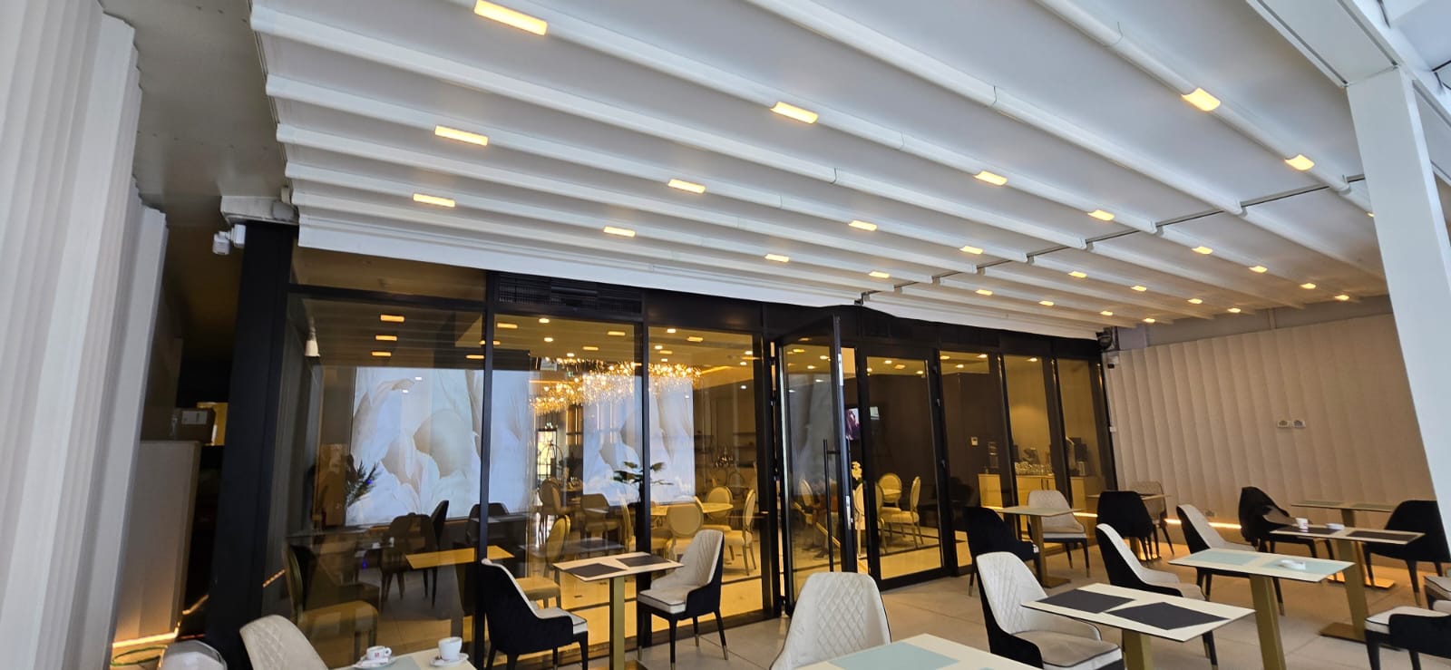 Echipa Tende a realizat o pergolă retractabilă albă și o fațadă perete cortină cu uși batante, oferind un spațiu elegant, versatil și confortabil în orice sezon.