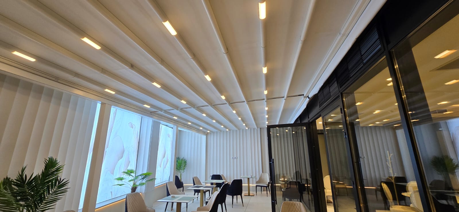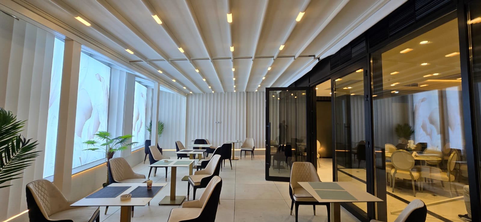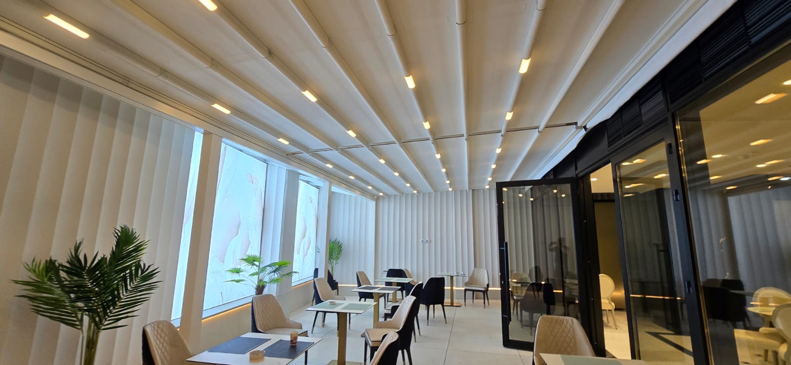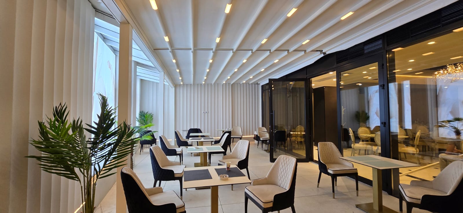 Echipa Tende a realizat o pergolă retractabilă albă și o fațadă perete cortină cu uși batante, oferind un spațiu elegant, versatil și confortabil în orice sezon.